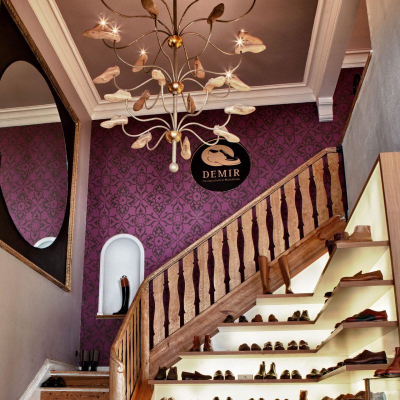Neben konfektionierten Maßschuhen der Traditionsmanufakturen Crockett & Jones, Dinkelacker, Ludwig Reiter, Carmina, Santoni und Cheaney für Damen und Herren bilden die handgearbeiteten Maßschuhe von Ibrahim Demir das Herzstück des Ateliers.
